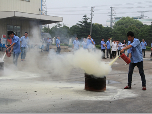 本次消防演練設(shè)消防安全工作基本常識培訓(xùn)、火災(zāi)撲救消防器材技能培訓(xùn)以及三公斤干粉滅火器油盆滅火比賽、團隊2人二檔消防栓出水比賽等四項議程。中聯(lián)高分子交聯(lián)部、高分子膠料部、金屬拉絲、金屬焊帶共30多名員工參加演練。