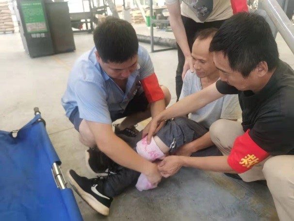 演練的第一項(xiàng)內(nèi)容:模擬車間人員腿部受傷后大量出血,車間應(yīng)急救護(hù)小組立即采取應(yīng)急包扎措施,緊急處置后進(jìn)行傷員轉(zhuǎn)移。